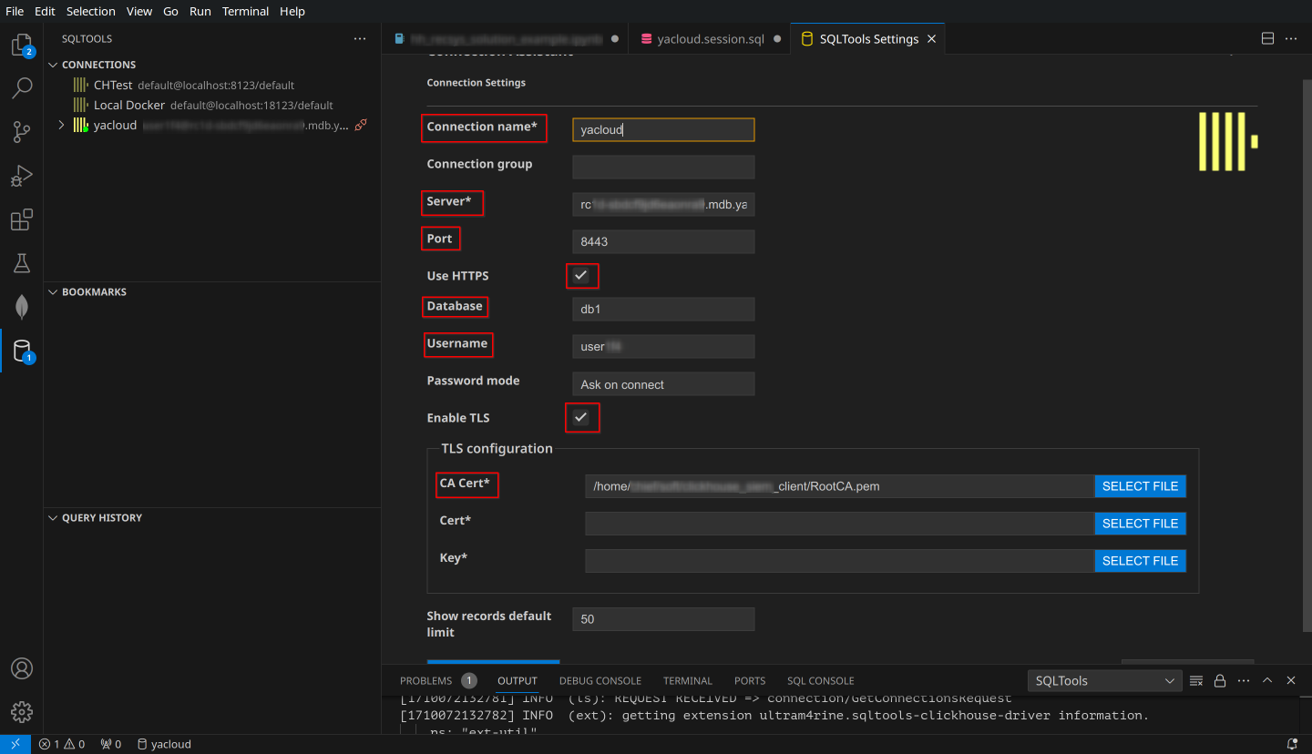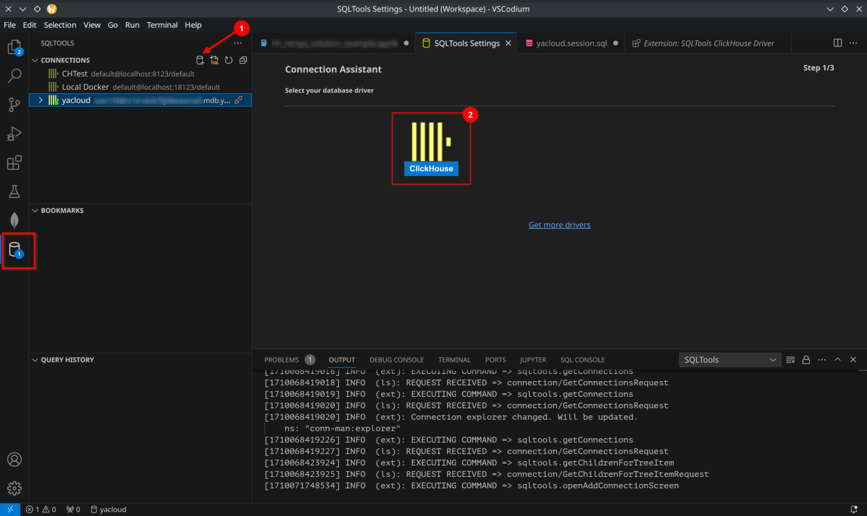 В Visual Studio Code есть очень удобный графический интерфейс для работы с различными СУБД. Для этого необходимо поставить дополнения SQLTools и SQLTools ClickHouse Driver.